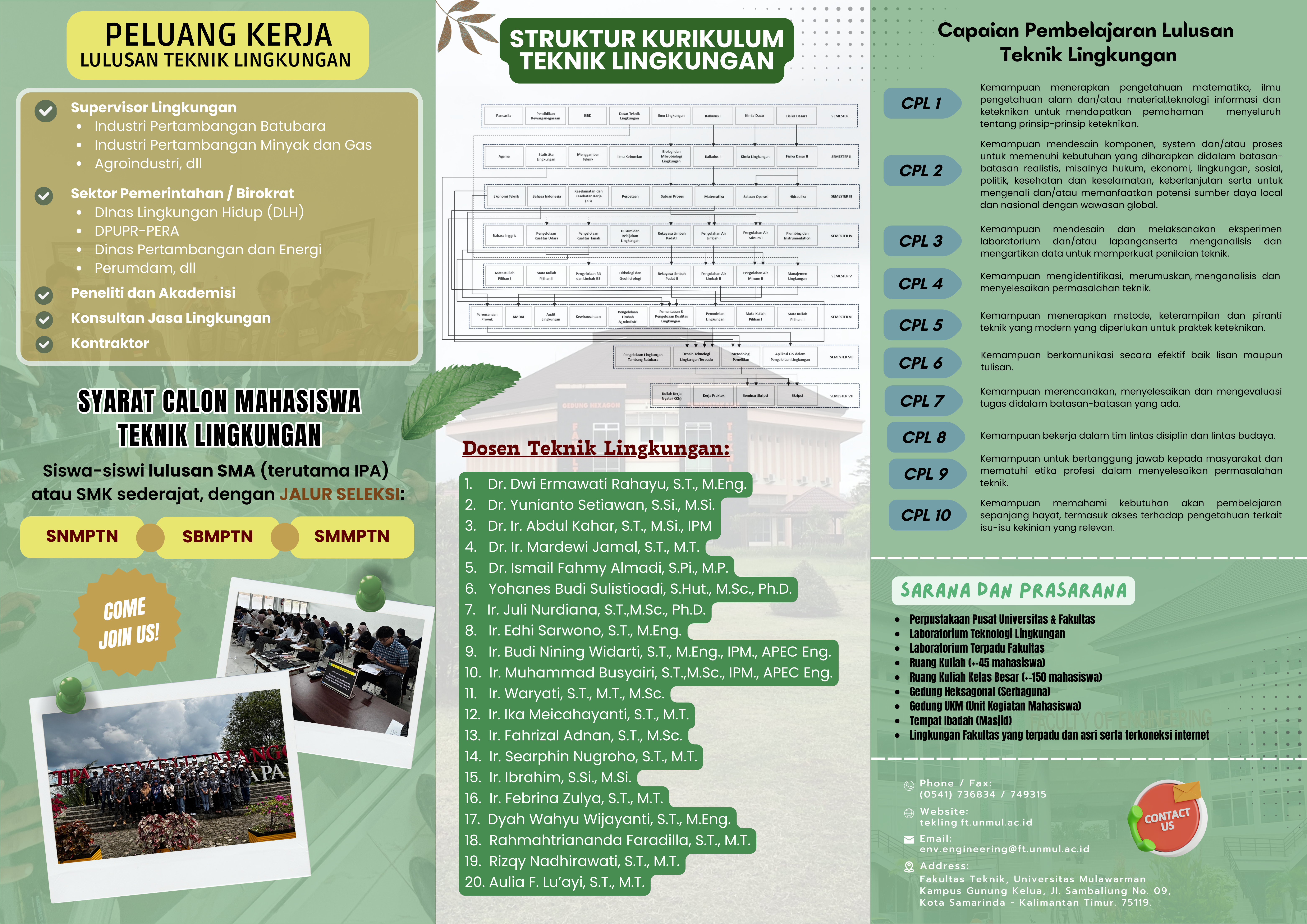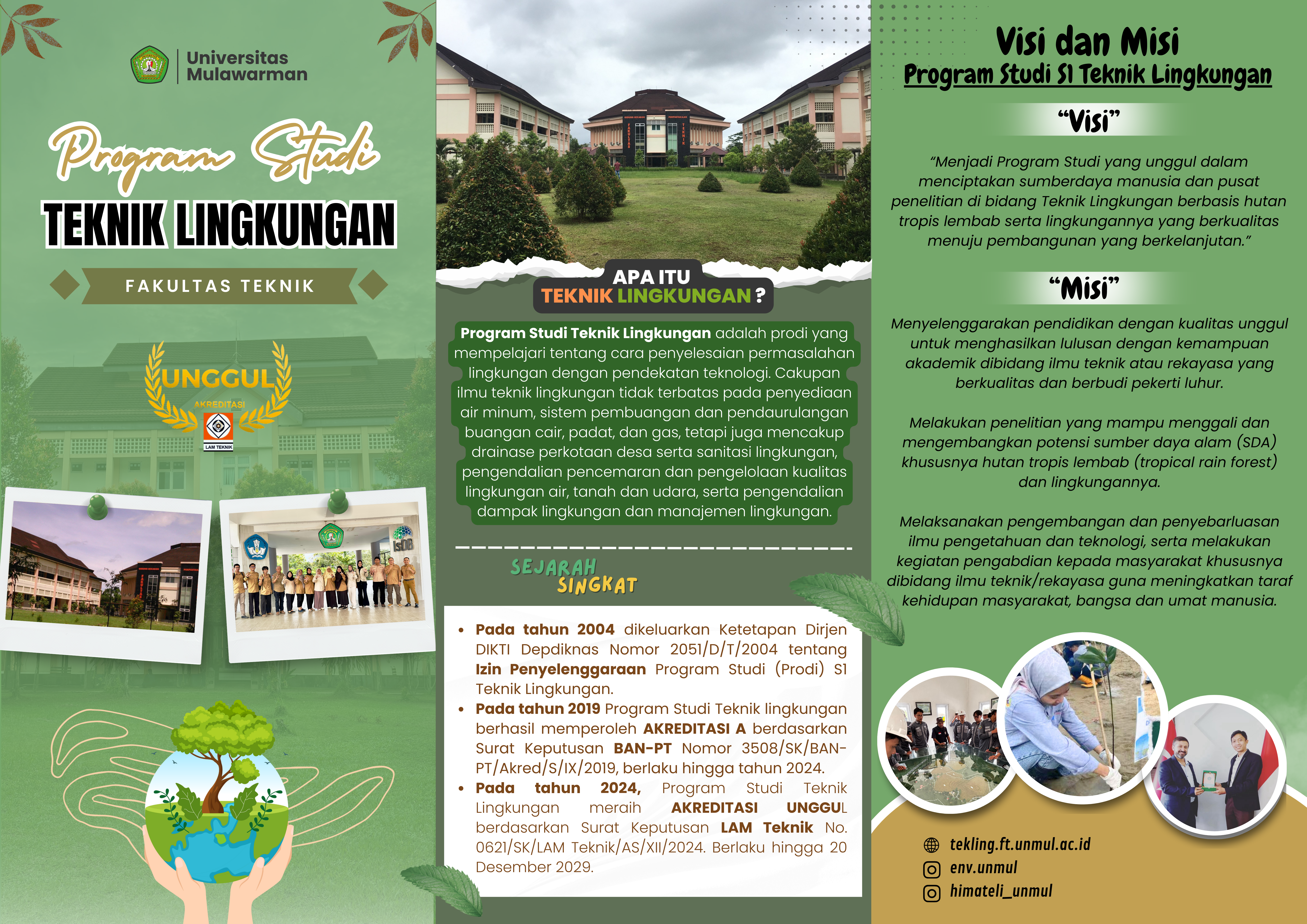 Program Studi (Prodi) Teknik Lingkungan (TL) adalah prodi yang mempelajari tentang cara penyelesaian permasalahan lingkungan dengan pendekatan teknologi. Cakupan ilmu TL mencakup penyediaan air minum, sistem pembuangan dan pendaurulangan buangan cair, padat, dan gas, drainase perkotaan dan desa, sanitasi lingkungan, pengendalian pencemaran dan pengelolaan kualitas lingkungan air, tanah dan udara, serta pengendalian dampak lingkungan dan manajemen lingkungan.